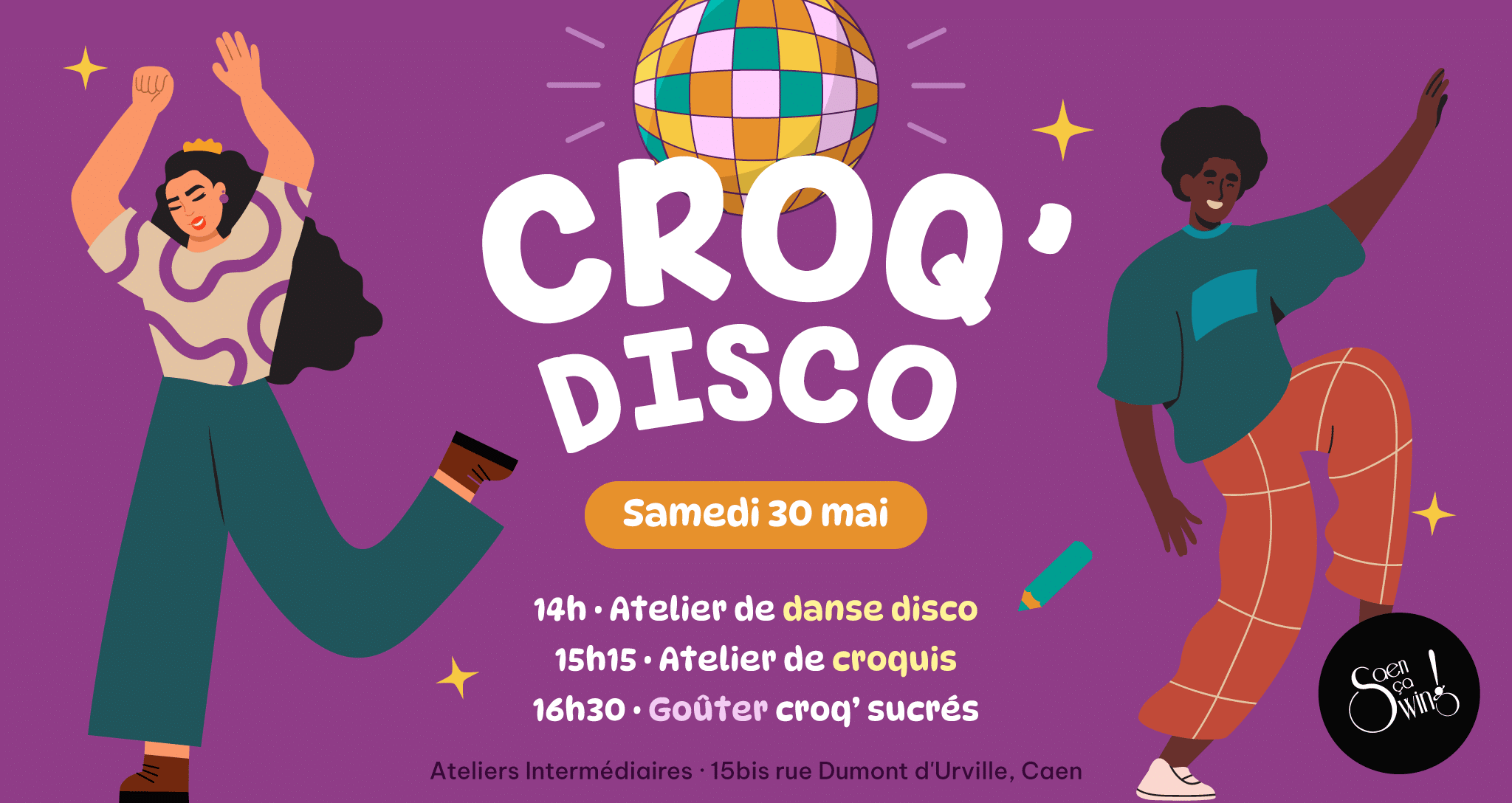 Les Ateliers Intermédiaires 15 bis rue Dumont d'Urville, Caen, FranceEn mai, on fait ce qu'il nous plaît ! Alors on a décidé d'organiser un petit stage bi-goût :) Au programme : 14h - Un atelier de danse disco avec Juliette pour groover, s'éclater et lâcher prise ! 15h15 - Un atelier de croquis avec Rachel pour apprendre à dessiner des gens qui dansent (bah ouais, c'est le thème quand même !) 16h30 - C'est enfin l'heure du goûter ! On va déguster des croq' sucrés (recettes en cours d'invention), miam ! Prêt·e à venir croquer la vie avec nous ? :D -- Matériel de dessin fourni. Billetterie en ligne sur Helloasso (limité à 15 places) !